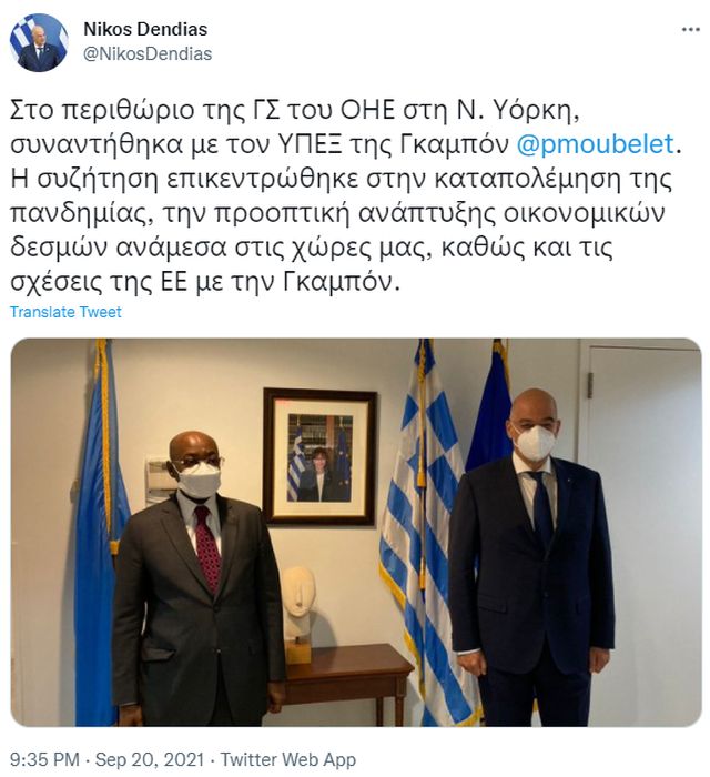 Με την ευκαιρία της Γενικής Συνέλευσης των Ηνωμένων Εθνών ο. κ. Δένδιας είχε την ευκαιρία να συναντήσει των υπουργό Εξωτερικών της Γκάμπια, τον υπουργό Εξωτερικών της Γκαμπόν, τον υπουργό Εξωτερικών της Κόστα Ρίκα και βέβαια τον Νίκο Χριστοδουλίδη, τον υπουργό Εξωτερικών της Κύπρου και τον πρόεδρο της Γενικής Συνέλευσης του ΟΗΕ, τον υπουργό Εξωτερικών των Μαλβίδων.