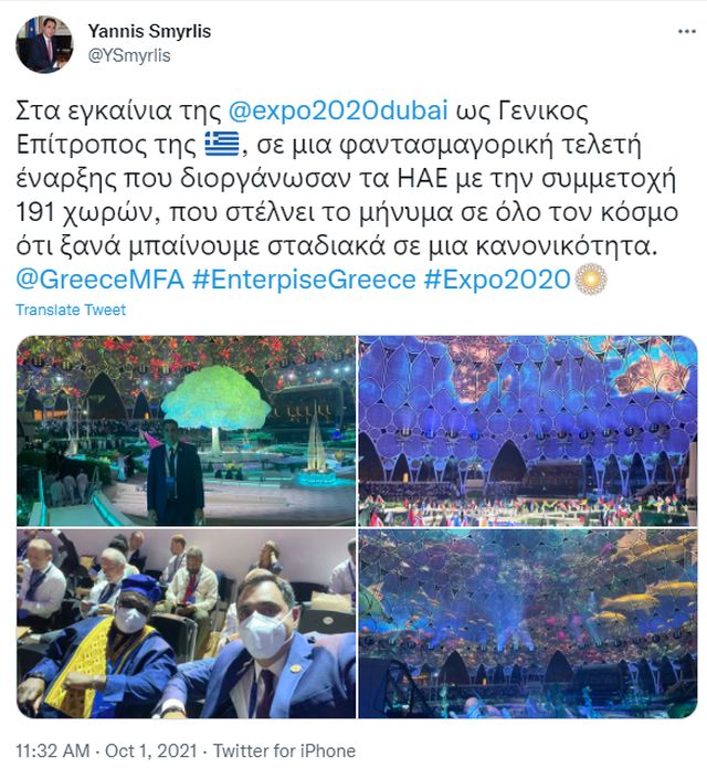 Ο Γενικός Γραμματέας Διεθνών Οικονομικών Σχέσεων και Εξωστρέφειας του Υπουργείου Εξωτερικών και Πρόεδρος της Enterprise Greece, κ. Ιωάννης Σμυρλής εκπροσώπησε την Ελλάδα στην Τελετή Εγκαινίων της Παγκόσμιας Έκθεσης «Dubai Expo 2020» που πραγματοποιήθηκε εχθές, στις 30 Σεπτεμβρίου, στο Ντουμπάι.