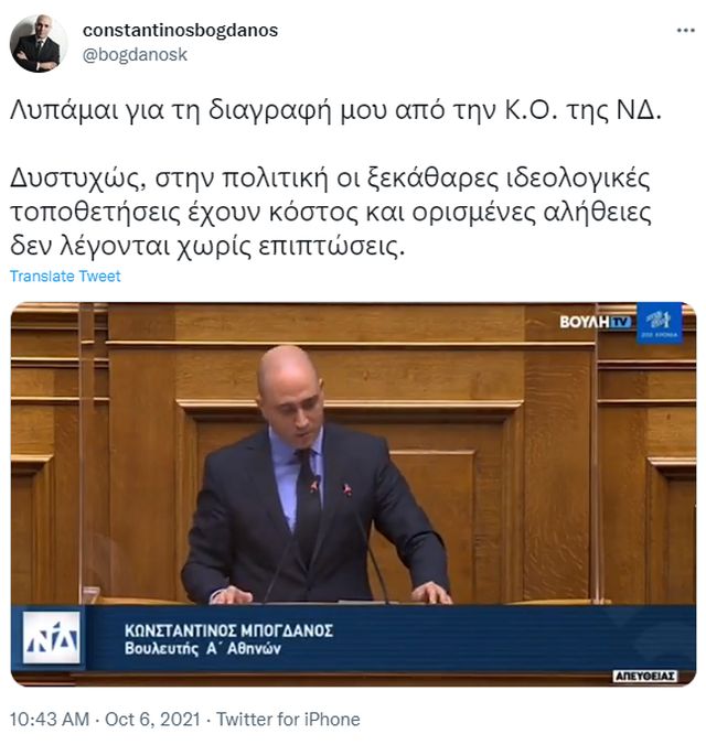 Αμετανόητος ο Κωνσταντίνος Μπογδάνος. Υποστηρίζει -σε ανάρτησή του στο Twitter- ότι διεγράφη επειδή έχει «ξεκάθαρες» πολιτικές θέσεις και αυτές, λέει, έχουν κόστος και δεν λέγονται χωρίς επιπτώσεις.