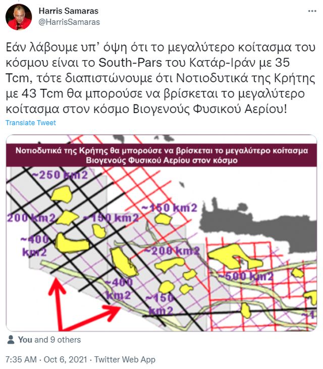 «Εάν λάβουμε υπ’ όψη ότι το μεγαλύτερο κοίτασμα του κόσμου είναι το South-Pars του Κατάρ-Ιράν με 35 Tcm, τότε διαπιστώνουμε ότι Νοτιοδυτικά της Κρήτης με 43 Tcm θα μπορούσε να βρίσκεται το μεγαλύτερο κοίτασμα στον κόσμο Βιογενούς Φυσικού Αερίου!», έγραψε ο οικονομολόγος Χάρης Σαμάρας, με ειδικότητα στην διαχείριση κινδύνων και τη γεωοικονομία, σε ανάρτησή του στο Twitter.