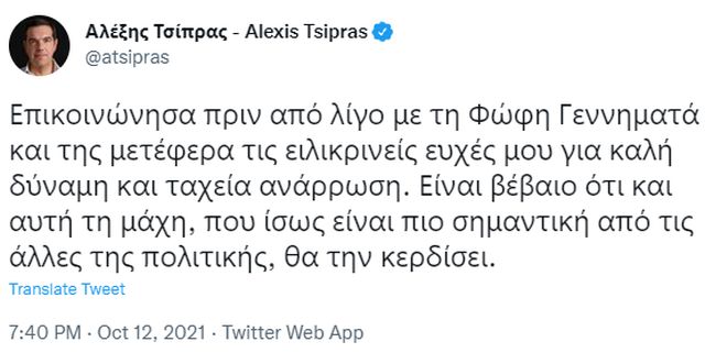 «Επικοινώνησα πριν από λίγο με τη Φώφη Γεννηματά και της μετέφερα τις ειλικρινείς ευχές μου για καλή δύναμη και ταχεία ανάρρωση.