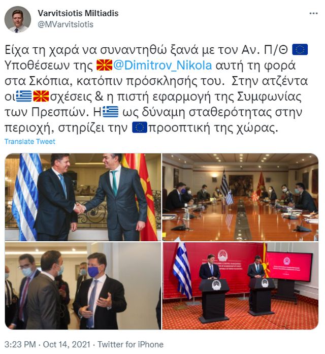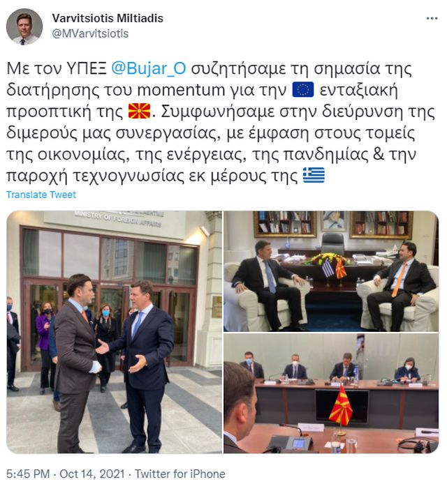 «Για εμάς, η ευρωπαϊκή προοπτική των Δυτικών Βαλκανίων είναι μία εθνική πολιτική την οποία υπηρετούμε εδώ και σχεδόν δύο δεκαετίες και θεωρούμε ότι τα βήματα προς αυτή την κατεύθυνση από την πλευρά της Ευρώπης πρέπει να είναι γρήγορα και αποφασιστικά» δήλωσε ο Μιλτιάδης Βαρβιτσιώτης, μετά τη συνάντηση του με τον αναπληρωτή πρωθυπουργό για τις Ευρωπαϊκές Υποθέσεις της Δημοκρατίας της Βόρειας Μακεδονίας, Νίκολα Ντιμιτρόφ, την Πέμπτη στα Σκόπια.