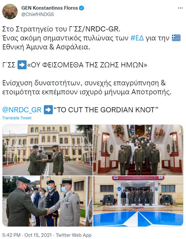 Ο αρχηγός ΓΕΕΘΑ, με ανάρτησή του στο twitter, αναφορικά με την επίσκεψη στο αρχηγείο του Γ’ Σώματος Στρατού, υπογράμμισε ότι αποτελεί «σημαντικό πυλώνα των Ενόπλων Δυνάμεων για την Εθνική Άμυνα και Ασφάλεια» ενώ, μεταξύ άλλων, πρόσθεσε: