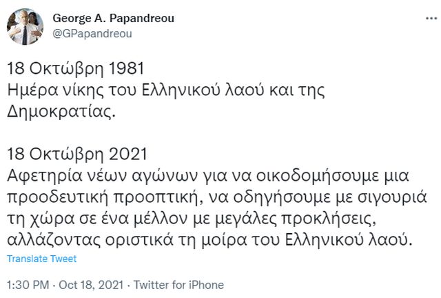 »18 Οκτώβρη 2021 Αφετηρία νέων αγώνων για να οικοδομήσουμε μια προοδευτική προοπτική, να οδηγήσουμε με σιγουριά τη χώρα σε ένα μέλλον με μεγάλες προκλήσεις, αλλάζοντας οριστικά τη μοίρα του Ελληνικού λαού», έγραψε ο Γιώργος Παπανδρέου.