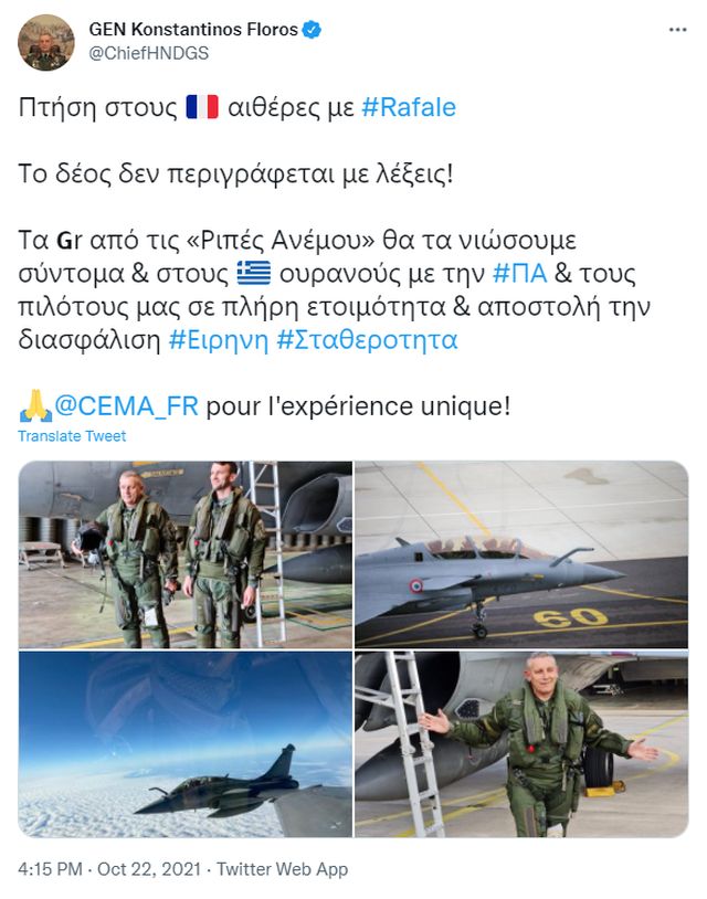 Την εμπειρία πτήσης με Rafale θέλησε να μοιραστεί στο Twitter o αρχηγός ΓΕΕΘΑ (ευρισκόμενος στη Γαλλία) Κωνσταντίνος Φλώρος.
