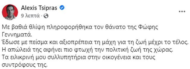 «Με βαθιά θλίψη πληροφορήθηκα τον θάνατο της Φώφης Γεννηματά», έγραψε ο Αλέξης Τσίπρας σε μήνυμά του στο Facebook.