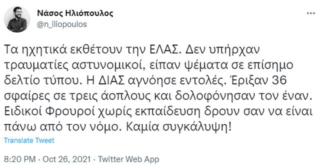 Όπως αναφέρει σε ανάρτησή του στα μέσα κοινωνικής δικτύωσης, από τα ηχητικά ντοκουμέντα προκύπτει πως «δεν υπήρχαν τραυματίες αστυνομικοί», ενώ προσθέτει ότι «είπαν ψέματα σε επίσημο δελτίο Τύπου».