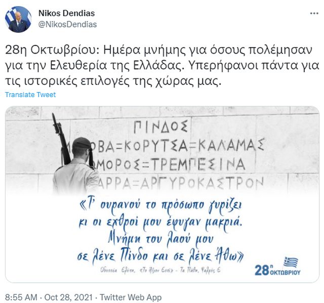 Σε ανάρτησή του στο Twitter για την εθνική επέτειο του «ΟΧΙ» ο Νίκος Δένδιας υπογράμμισε την υπερηφάνεια για τις ιστορικές επιλογές της χώρας μας.