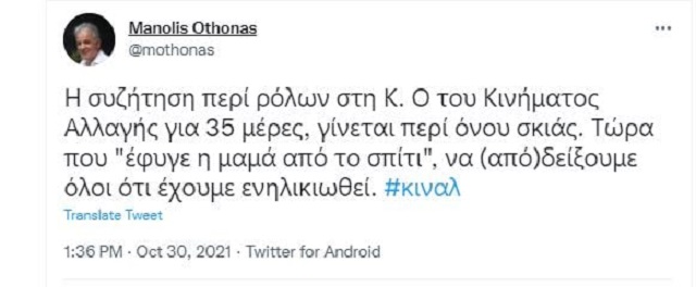 »Τώρα που “έφυγε η μαμά από το σπίτι”, να (από)δείξουμε όλοι ότι έχουμε ενηλικιωθεί» έγραψε στο twitter ο Μανώλης Όθωνας, εκ των πιο στενών συνεργατών της προέδρου του ΚΙΝΑΛ και διευθυντής του γραφείου της.