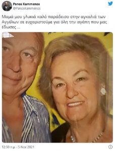 «Μαμά μου γλυκιά καλό παράδεισο στην αγκαλιά των Αγγέλων σε ευχαριστούμε για όλη την αγάπη που μας έδωσες…», έγραψε χαρακτηριστικά ο Πάνος Καμμένος.