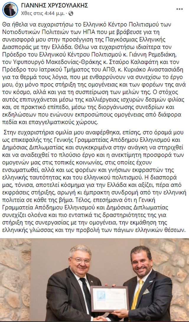 Το Ελληνικό Κέντρο Πολιτισμού των Νοτιοδυτικών Πολιτειών των ΗΠΑ τίμησε στη Θεσσαλονίκη τον Γενικό Γραμματέα Απόδημου Ελληνισμού και Δημόσιας Διπλωματίας του Υπουργείου Εξωτερικών, κ. Γιάννη Χρυσουλάκη, τον οποίο βράβευσε για την τεράστια προσφορά του στην προσέγγιση της Παγκόσμιας Ελληνικής Διασποράς με την Ελλάδα.