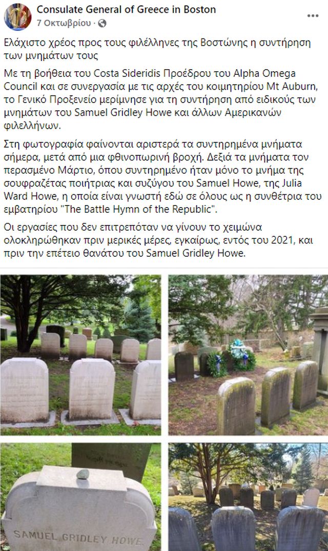 »Με τη βοήθεια του Costa Sideridis Προέδρου του Alpha Omega Council και σε συνεργασία με τις αρχές του κοιμητηρίου Mt Auburn, το Γενικό Προξενείο μερίμνησε για τη συντήρηση από ειδικούς των μνημάτων του Samuel Gridley Howe και άλλων Αμερικανών φιλελλήνων.