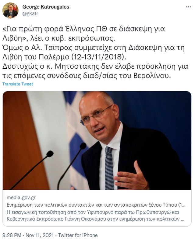 Τη δήλωση του κυβερνητικού εκπροσώπου, Γιάννη Οικονόμου, πώς για πρώτη φορά Έλληνας πρωθυπουργός θα βρεθεί σε διάσκεψη για τη Λιβύη, σχολίασε σκωπτικά στο twitter ο Γιώργος Κατρούγκαλος.