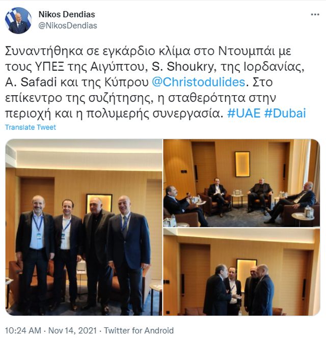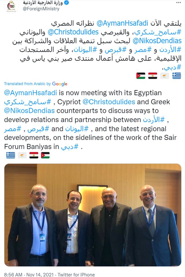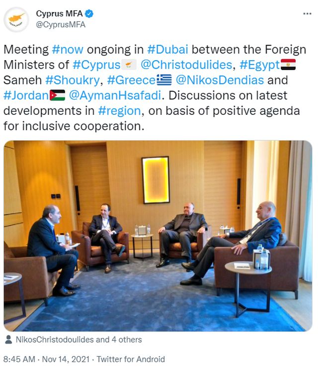 🇨🇾🇪🇬🇬🇷🇯🇴@Christodulides#SamehShoukry@NikosDendias@AymanHsafadi https://t.co/LbCgYQtCix pic.twitter.com/0Y8hrOsIxF— Demetris Samuel (@Demetris_Samuel) November 14, 2021