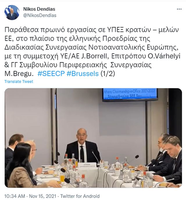 Πρωινό εργασίας παρέθεσε, στις Βρυξέλλες, ο υπουργός Εξωτερικών, Νίκος Δένδιας, εκ μέρους της Προεδρίας της Διαδικασίας Συνεργασίας Νοτιοανατολικής Ευρώπης, την οποία ασκεί η χώρα μας.