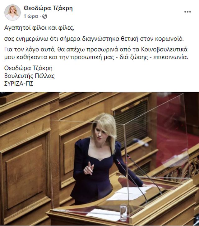 Με κορωνοϊό διαγνώστηκε η πλήρως εμβολιασμένη Θεοδώρα Τζάκρη. Η βουλευτής του ΣΥΡΙΖΑ Προοδευτική Συμμαχία, τομεάρχης Απόδημου Ελληνισμού και πρώην υπουργός έγραψε σε ανάρτησή της στο Facebook: