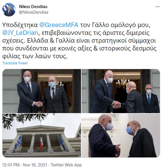 Θερμή υποδοχή στον Γάλλο ομόλογό του, Ζαν-Ιβ Λε Ντριάν, επεφύλαξε ο υπουργός Εξωτερικών, Νίκος Δένδιας, λίγo μετά τις 11.00, στην είσοδο του υπουργείου.