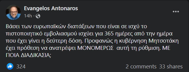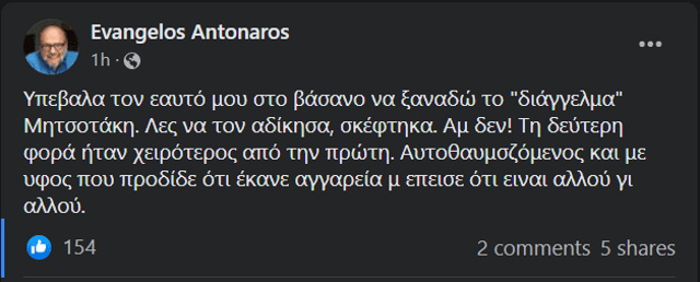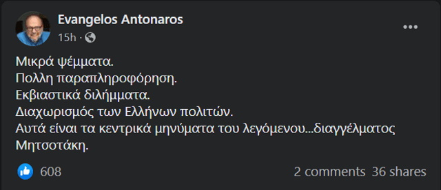 Την πλήρη απογοήτευσή του από το διάγγελμα του πρωθυπουργού Κυριάκου Μητσοτάκη εκφράζει ο Ευάγγελος Αντώναρος μέσω αναρτήσεών του στο Facebook.