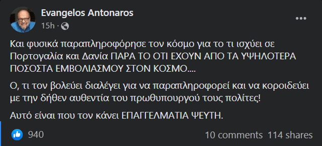 Και φυσικά παραπληροφόρησε τον κόσμο για το τι ισχύει σε Πορτογαλία και Δανία ΠΑΡΑ ΤΟ ΟΤΙ ΕΧΟΥΝ ΑΠΟ ΤΑ ΥΨΗΛΟΤΕΡΑ ΠΟΣΟΣΤΑ ΕΜΒΟΛΙΑΣΜΟΥ ΣΤΟΝ ΚΟΣΜΟ…
