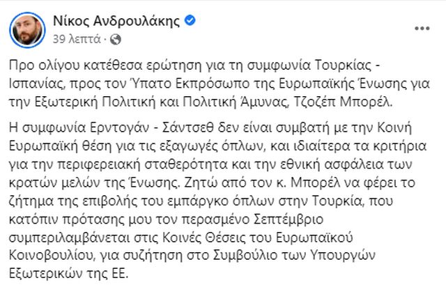 »Ζητώ από τον κ. Μπορέλ να φέρει το ζήτημα της επιβολής του εμπάργκο όπλων στην Τουρκία, που κατόπιν πρότασης μου τον περασμένο Σεπτέμβριο συμπεριλαμβάνεται στις Κοινές Θέσεις του Ευρωπαϊκού Κοινοβουλίου, για συζήτηση στο Συμβούλιο των Υπουργών Εξωτερικών της ΕΕ».