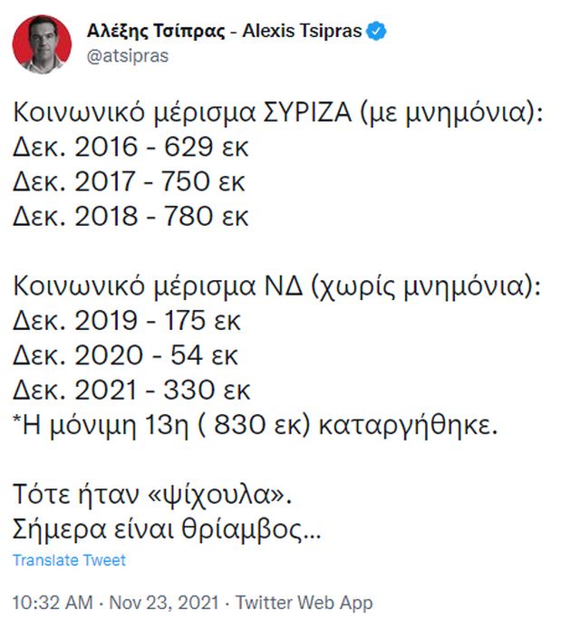 Στη σύγκριση του κοινωνικού μερίσματος που έδωσε ο ΣΥΡΙΖΑ-ΠΣ κατά τη διακυβέρνησή του και σ’ αυτό της κυβέρνησης της ΝΔ προέβη ο πρόεδρος του ΣΥΡΙΖΑ-ΠΣ, Αλέξης Τσίπρας με ανάρτησή του στα μέσα κοινωνικής δικτύωσης.