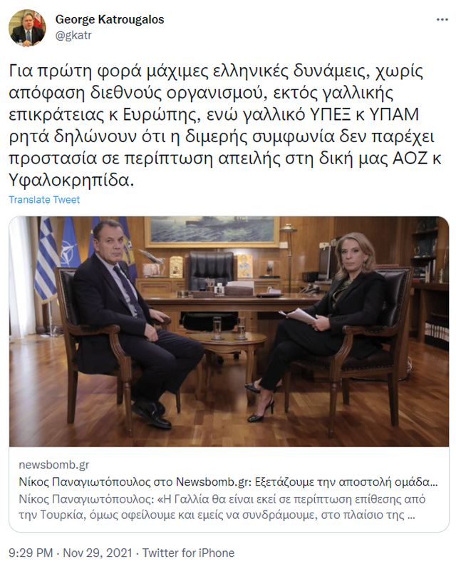 «Για πρώτη φορά μάχιμες ελληνικές δυνάμεις, χωρίς απόφαση διεθνούς οργανισμού, εκτός γαλλικής επικράτειας κ Ευρώπης, ενώ γαλλικό ΥΠΕΞ κ ΥΠΑΜ ρητά δηλώνουν ότι η διμερής συμφωνία δεν παρέχει προστασία σε περίπτωση απειλής στη δική μας ΑΟΖ κ Υφαλοκρηπίδα».