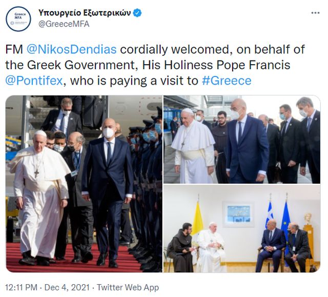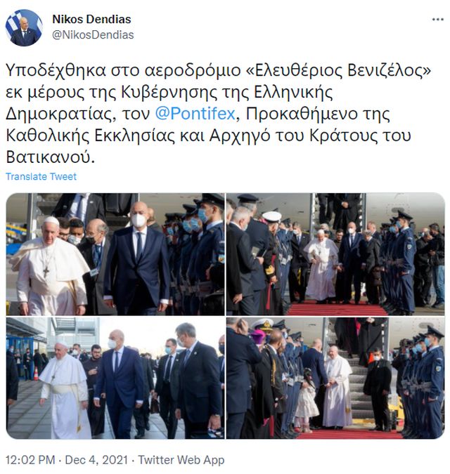 Τον Προκαθήμενο της Ρωμαιοκαθολικής Εκκλησίας υποδέχθηκε στο αεροδρόμιο, εκ μέρους της κυβέρνησης, ο υπουργός Εξωτερικών, Νίκος Δένδιας.