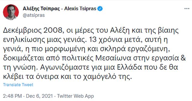 Για «πολιτικές Μεσαίωνα» στην εργασία και στη γνώση κάνει λόγο ο αρχηγός της αξιωματικής αντιπολίτευσης Αλέξης Τσίπρας σε ανάρτησή του για τη σημερινή επέτειο της δολοφονίας του Αλέξη Γρηγορόπουλου.