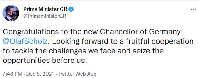 Συγχαρητήριο μήνυμα έστειλε ο Έλληνας πρωθυπουργός, Κυριάκος Μητσοτάκης, στον Όλαφ Σολτς που ανέλαβε και επίσημα την καγκελαρία της Γερμανίας.