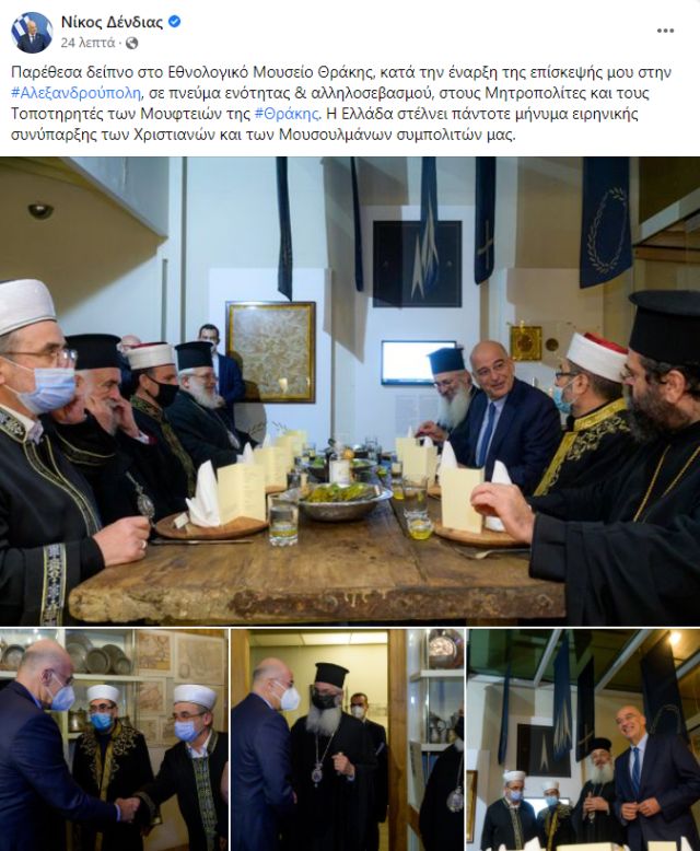 «Παρέθεσα δείπνο στο Εθνολογικό Μουσείο Θράκης, κατά την έναρξη της επίσκεψής μου στην Αλεξανδρούπολη, σε πνεύμα ενότητας και αλληλοσεβασμού, στους Μητροπολίτες και τους Τοποτηρητές των Μουφτειών της Θράκης.