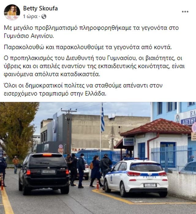 Όλους τους δημοκρατικούς πολίτες να σταθούν απέναντι σε περιστατικά όπως της «απαγωγής» του Γυμνασιάρχη Αιγινίου από ψεκασμένους «Θεματοφύλακες», κάλεσε η βουλευτής Πιερίας του ΣΥΡΙΖΑ – Προοδευτική Συμμαχία, Μπέττυ Σκούφα, σε ανάρτησή της στο Facebook. Η κα. Σκούφα έγραψε: