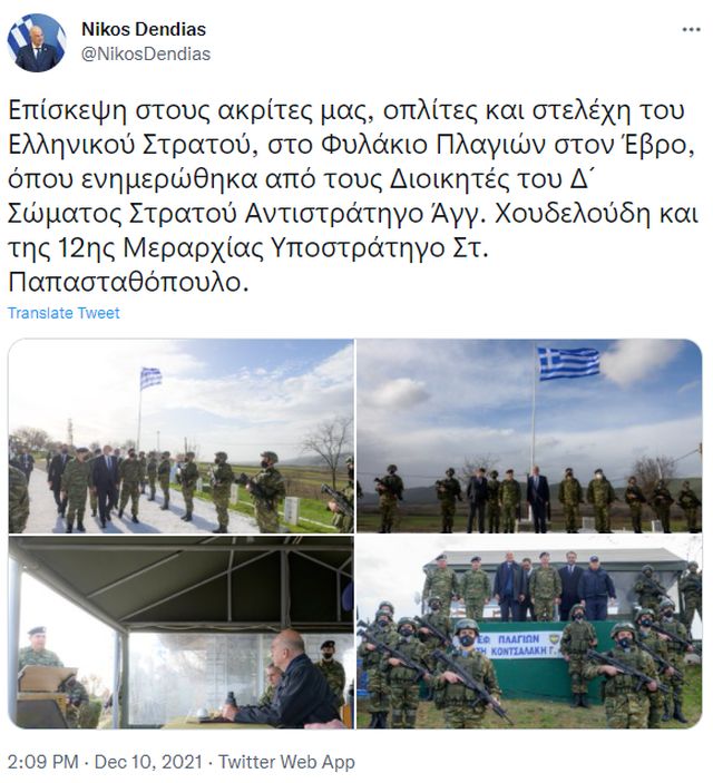 «Επίσκεψη στους ακρίτες μας, οπλίτες και στελέχη του Ελληνικού Στρατού, στο Φυλάκιο Πλαγιών στον Έβρο, όπου ενημερώθηκα από τους Διοικητές του Δ´ Σώματος Στρατού Αντιστράτηγο Άγγ. Χουδελούδη και της 12ης Μεραρχίας Υποστράτηγο Στ. Παπασταθόπουλο».