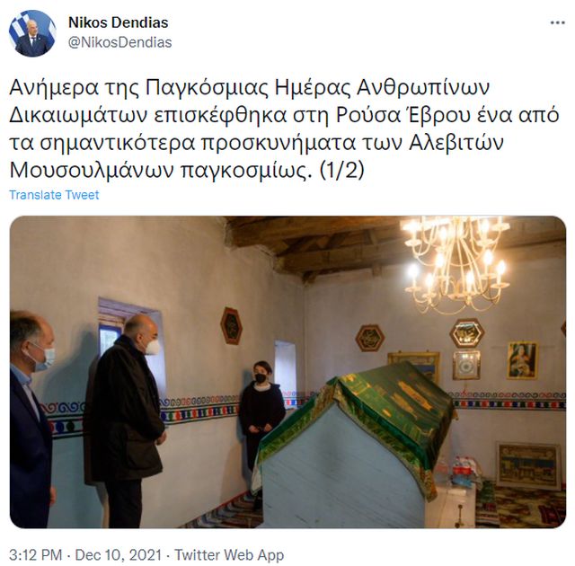 «Ανήμερα της Παγκόσμιας Ημέρας Ανθρωπίνων Δικαιωμάτων επισκέφθηκα στη Ρούσα Έβρου ένα από τα σημαντικότερα προσκυνήματα των Αλεβιτών Μουσουλμάνων παγκοσμίως», έγραψε ο Νίκος Δένδιας στο Twitter και συνέχισε: