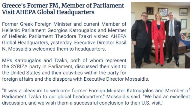 Ο πρώην υπουργός Εξωτερικών της Ελλάδας και νυν βουλευτής, Γεώργιος Κατρούγκαλος και η βουλευτής Θεοδώρα Τζάκρη επισκέφτηκαν τα Παγκόσμια Κεντρικά Γραφεία της AHEPA. Ο εκτελεστικός διευθυντής Βασίλειος Ν. Μωσσαΐδης τους καλωσόρισε στα κεντρικά γραφεία του ομογενειακού Τάγματος.
