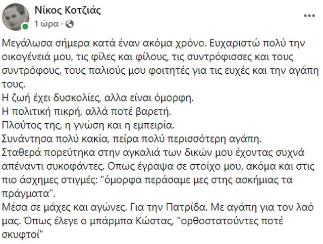 Ανήμερα του Χειμερινού Ηλιοστασίου, 21 Δεκεμβρίου, ο Νίκος Κοτζιάς έχει γενέθλια. Και στις αναρίθμητες ευχές που λαμβάνει από το πρωί απάντησε μέσω Facebook: