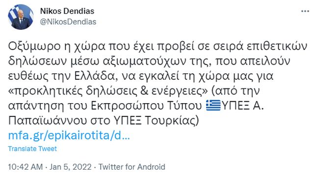 «Αυτές οι αυταπάτες του Δένδια αποτελούν περαιτέρω απόδειξη ότι η Ελλάδα προτιμά την ένταση αναζητώντας βοήθεια από τρίτα μέρη και δημιουργώντας τεχνητές συμμαχίες κατά της Τουρκίας, αντί να επιλύει τα διμερή της ζητήματα και να αναπτύσσει σχέσεις μέσα από έναν ειλικρινή και ουσιαστικό διάλογο με τη χώρα μας.
