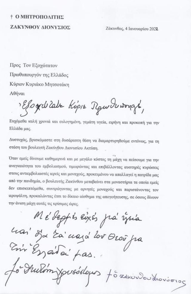 Με επιστολή του στον πρωθυπουργό, Κυριάκο Μητσοτάκη, ο μητροπολίτης Ζακύνθου, Διονύσιος διαμαρτύρεται έντονα για τη στάση του βουλευτή Ζακύνθου της Νέας Δημοκρατίας, Διονύση Ακτύπη, ο οποίος συναναστρέφεται αντιεμβολιαστές μοναχούς.