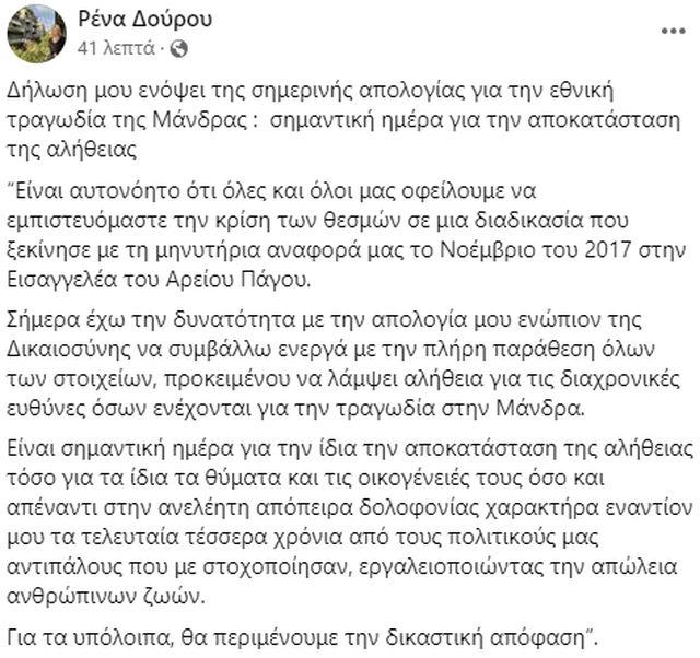 Η Ρένα Δούρου προέβη στην ακόλουθη δήλωση ενόψει της σημερινής απολογίας της για την εθνική τραγωδία της Μάνδρας υπό τον τίτλο «σημαντική ημέρα για την αποκατάσταση της αλήθειας».