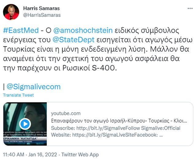 «Ο @amoshochstein ειδικός σύμβουλος ενέργειας του @StateDept εισηγείται ότι αγωγός μέσω Τουρκίας είναι η μόνη ενδεδειγμένη λύση.
