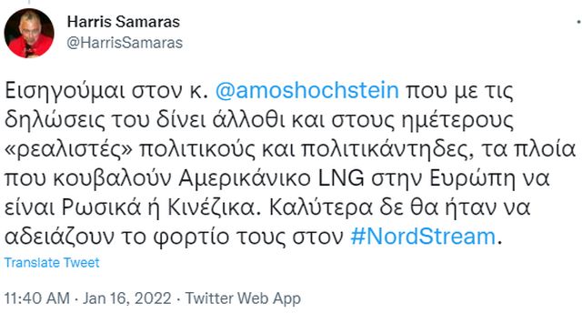 «Εισηγούμαι στον κ. @amoshochstein που με τις δηλώσεις του δίνει άλλοθι και στους ημέτερους “ρεαλιστές” πολιτικούς και πολιτικάντηδες, τα πλοία που κουβαλούν Αμερικάνικο LNG στην Ευρώπη να είναι Ρωσικά ή Κινέζικα.