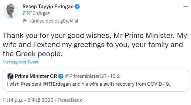 Περαστικά ευχήθηκε με ανάρτηση του στο twitter ο πρωθυπουργός Κυριάκος Μητσοτάκης στον Τούρκο πρόεδρο.