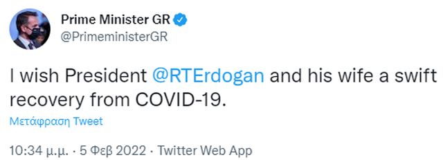 Εύχομαι στον Τούρκο πρόεδρο και την σύζυγο του γρήγορη ανάρρωση από την COVID19, αναφέρει στα αγγλικά στην ανάρτηση του ο Κυριάκος Μητσοτάκης.
