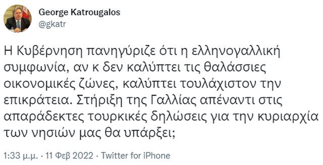 Στήριξη της Γαλλίας στην Ελλάδα, απέναντι στην απαράδεκτη αμφισβήτηση της ελληνικής κυριαρχίας στα ελληνικά νησιά, απαιτεί με ανάρτησή του στο Twitter ο Γιώργος Κατρούγκαλος.