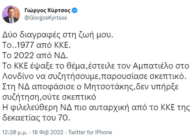 Την απόφαση της Νέας Δημοκρατίας να τον διαγράψει από το κόμμα σχολιάζει ο ευρωβουλευτής Γιώργος Κύρτσος με αναρτήσεις του στο Twitter.