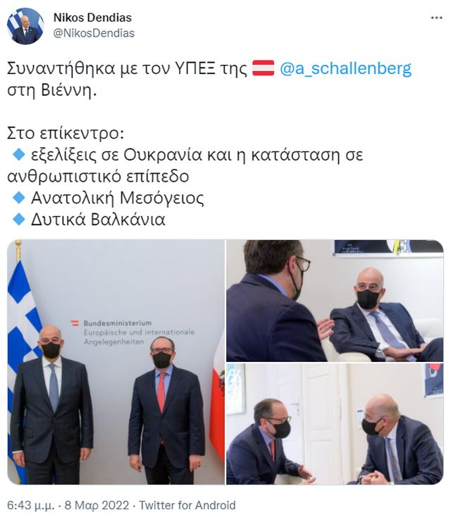 Εισαγωγικά ο Νίκος Δένδιας συμφώνησε με τον Αυστριακό υπουργό Εξωτερικών πως «η τεράστια ουκρανική κρίση, η εισβολή της Ρωσίας στην Ουκρανία δημιούργησε μια ενότητα μεταξύ των κρατών – μελών της ΕΕ, η οποία ήταν απίστευτη μόλις μερικές μέρες πριν» και προσέθεσε ότι η κατάσταση αυτή εγείρει μεγάλες προκλήσεις.