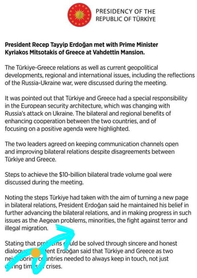 Κατά τη συνάντηση μεταξύ των δύο ηγετών τονίστηκε ότι η Τουρκία και η Ελλάδα φέρουν ιδιαίτερη ευθύνη στην αρχιτεκτονική ασφάλειας της Ευρώπης, η οποία αλλάζει με τη ρωσική επίθεση στην Ουκρανία, προστίθεται στην ανακοίνωση.