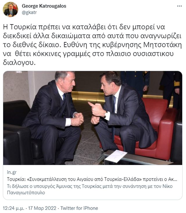 Την εξωφρενική δήλωση του Χουλουσί Ακάρ ότι ο Νίκος Παναγιωτόπουλος είναι θετικός στη συνεκμετάλλευση του Αιγαίου, σχολίασε με ανάρτησή του στο Twitter o Γιώργος Κατρούγκαλος.