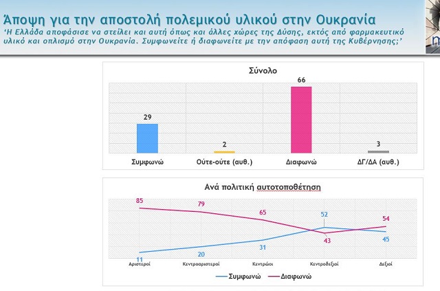 Δυο στους τρεις Έλληνες (66%) διαφωνούν με την αποστολή όπλων στην Ουκρανία που αποφάσισε και έπραξε ο πρωθυπουργός Κ. Μητσοτάκης, ενώ επίσης συντριπτικά οι Έλληνες, σε ποσοστό 70% είναι κατά της Ρωσίας στον πόλεμο με την Ουκρανία, σύμφωνα με το δεύτερο μέρος της δημοσκόπησης της Metron Analysis για το Mega.
