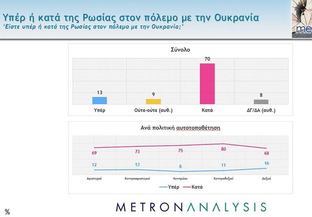 Συντριπτικά οι Έλληνες, σε ποσοστό 70% είναι κατά της Ρωσίας στον πόλεμο με την Ουκρανία και μόλις το 13% υπέρ.