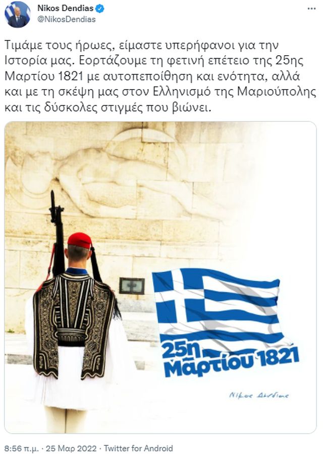 «Τιμάμε τους ήρωες, είμαστε υπερήφανοι για την Ιστορία μας. Εορτάζουμε τη φετινή επέτειο της 25ης Μαρτίου 1821 με αυτοπεποίθηση και ενότητα, αλλά και με τη σκέψη μας στον Ελληνισμό της Μαριούπολης και τις δύσκολες στιγμές που βιώνει», αναφέρει σε ανάρτησή του στο Twitter ο Νίκος Δένδιας και προσθέτει:
